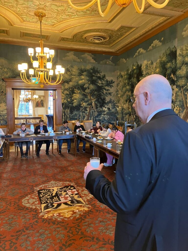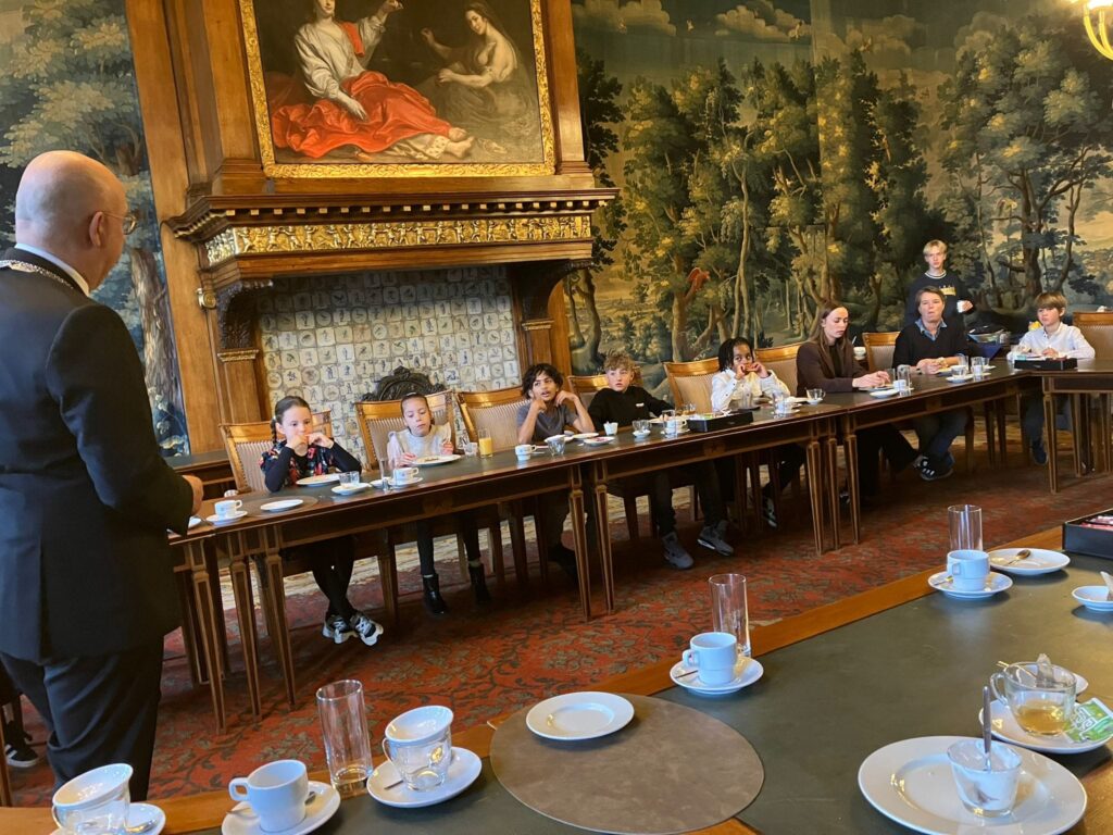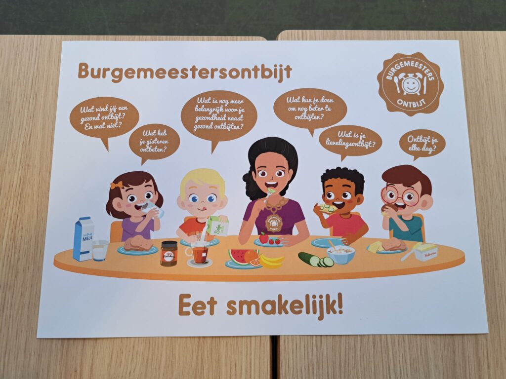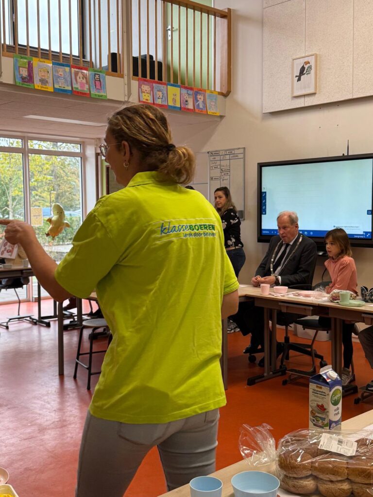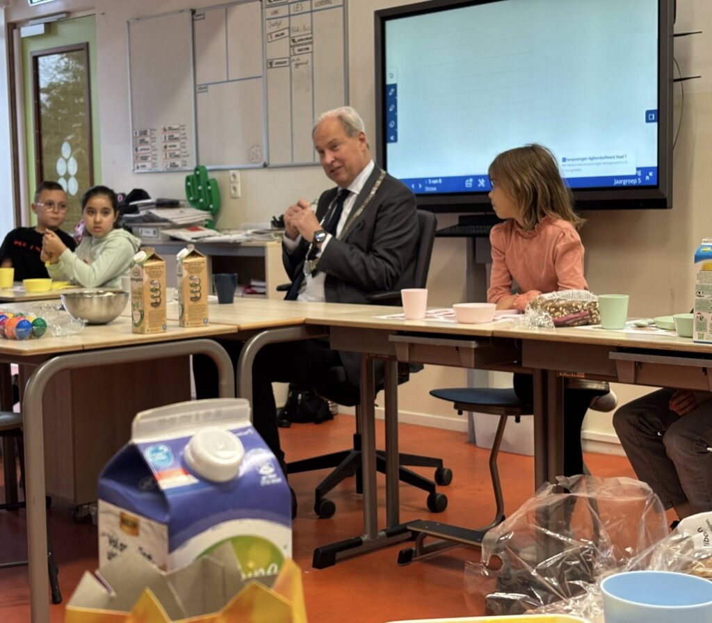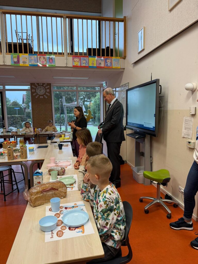 Hoog bezoek bij groep 5: de burgemeester van Gemeente Halderberge kwam ontbijten in de klas. De burgemeester vertelde over hoe belangrijk het ontbijt is om goed te kunnen leren.
